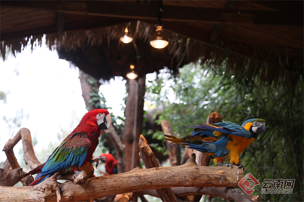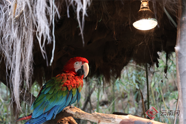 生活在热带亚热带的鹦鹉对低温比较敏感,园区将保温灯悬挂于栖木上方30厘米处,既避免羽毛被烫伤,又维持环境温度。同时在栖木间装了树洞造型的毛绒丰容鸟窝,保暖的同时,也丰富了其栖息场所。